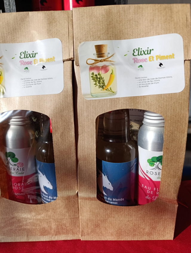 L'alliance de la douceur de la rose de Damas de la Roseraie du Cade (à Lacoste, Hérault) et du piquant de notre sirop de feu, avec une pointe de thym de nos champs.
