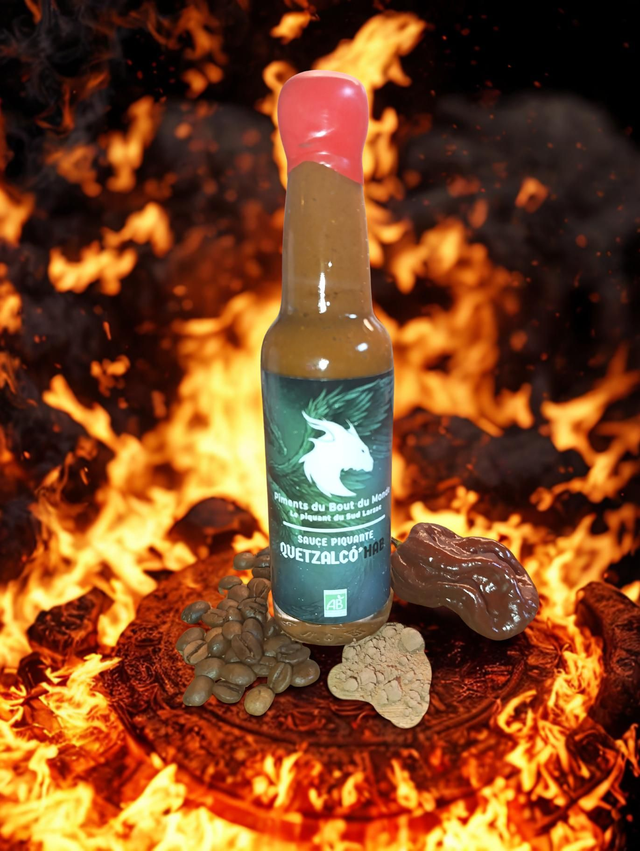 Sauce extra fort Inspirée du Dieu Quetzalcoàtl, serpent à plumes, cette sauce fermentée est la plus forte de notre gamme. Subtil mélange d'habanero chocolat, de cacao amer et de café, il suffit d'une larme pour parfumer votre plat.